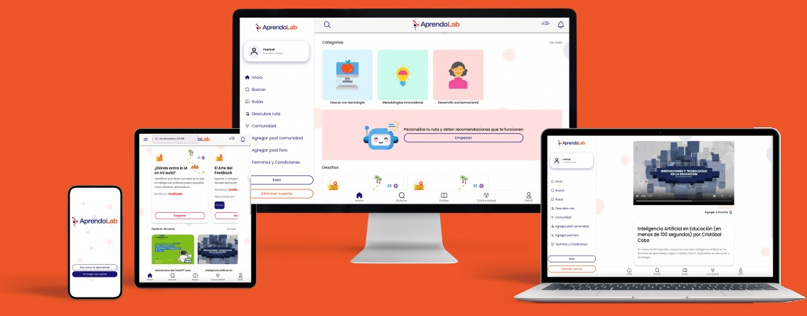 AprendoLab es una plataforma de desarrollo docente con IA. Ofrece rutas de aprendizaje personalizadas y adaptadas al contexto de cada uno.