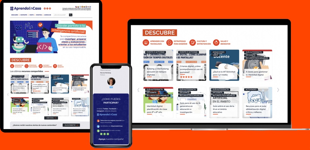 Aprendo en Casa es una plataforma colaborativa de más de 80 organizaciones de Latinoamérica y España que cuenta con recursos educativos gratuitos para docentes fomentando la innovación.